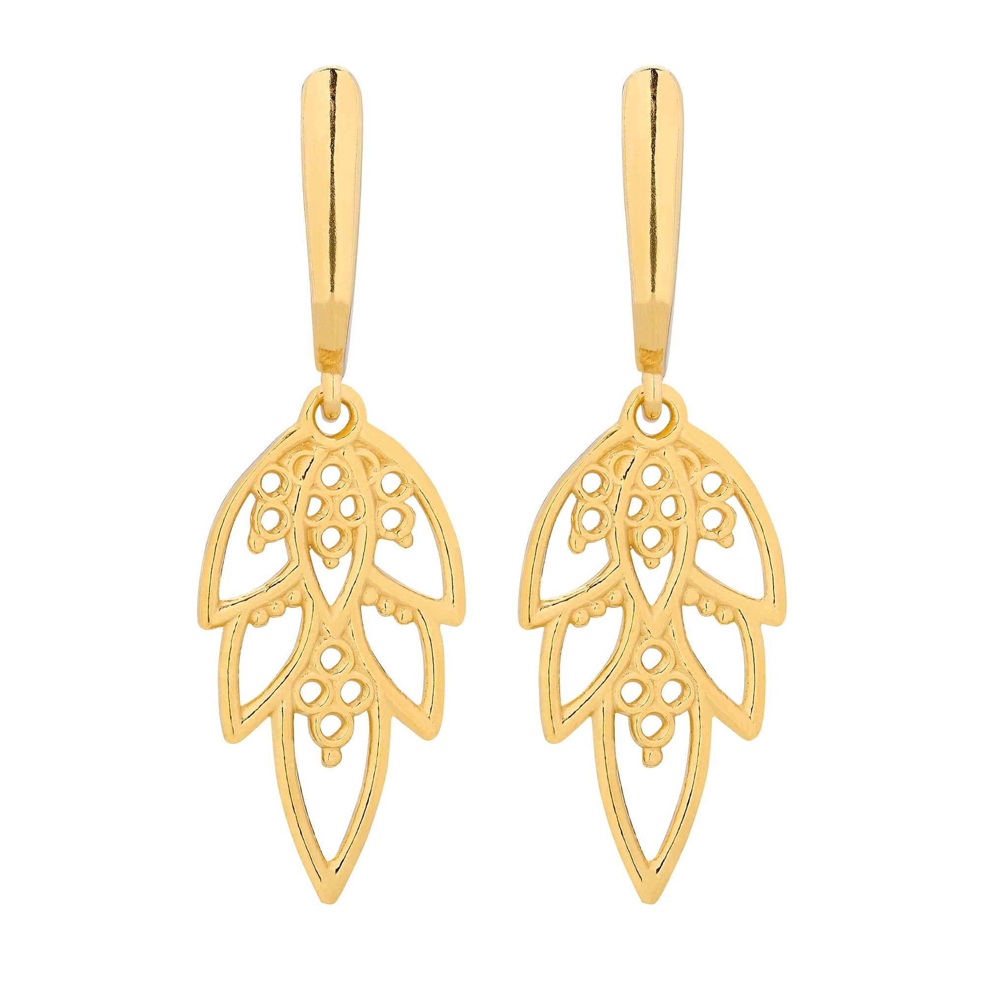 Złote długie kolczyki z ażurowymi rozetami. Zapinane na bigle angielskie. Całość wykonana ze srebra 925 powlekanego 24 karatowym żółtym złotem.