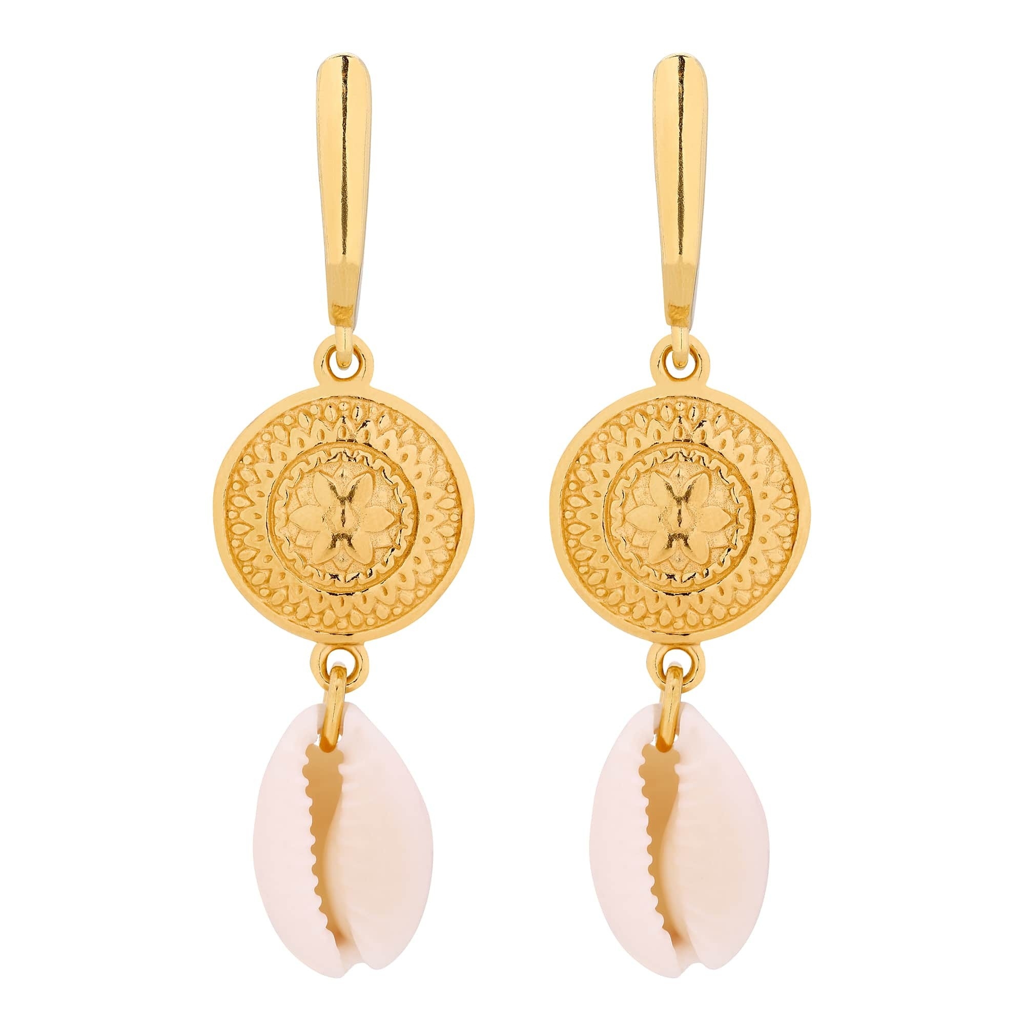 Złote długie kolczyki z rozetami i muszelkami. Zapinane na bigle angielskie. Całość wykonana ze srebra 925 powlekanego 24 karatowym żółtym złotem.