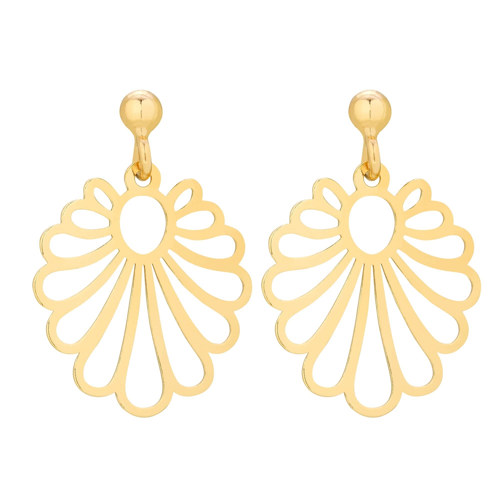Złote kolczyki z ażurowymi rozetkami. Zapinane na sztyft. Kolczyki posiadają zapięcia (baranki). Całość wykonana ze srebra 925 powlekanego 24 karatowym żółtym złotem.