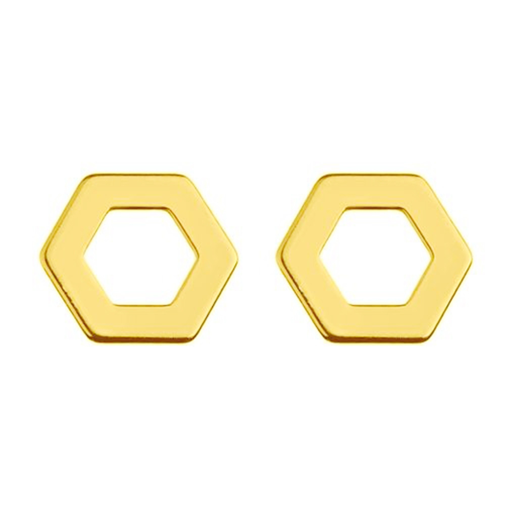 Złote kolczyki w kształcie sześciokątów. Zapinane na sztyft. Kolczyki posiadają zapięcia (baranki). Kolczyki w całości wykonane są ze srebra 925 powlekanego 24 karatowym żółtym złotem.