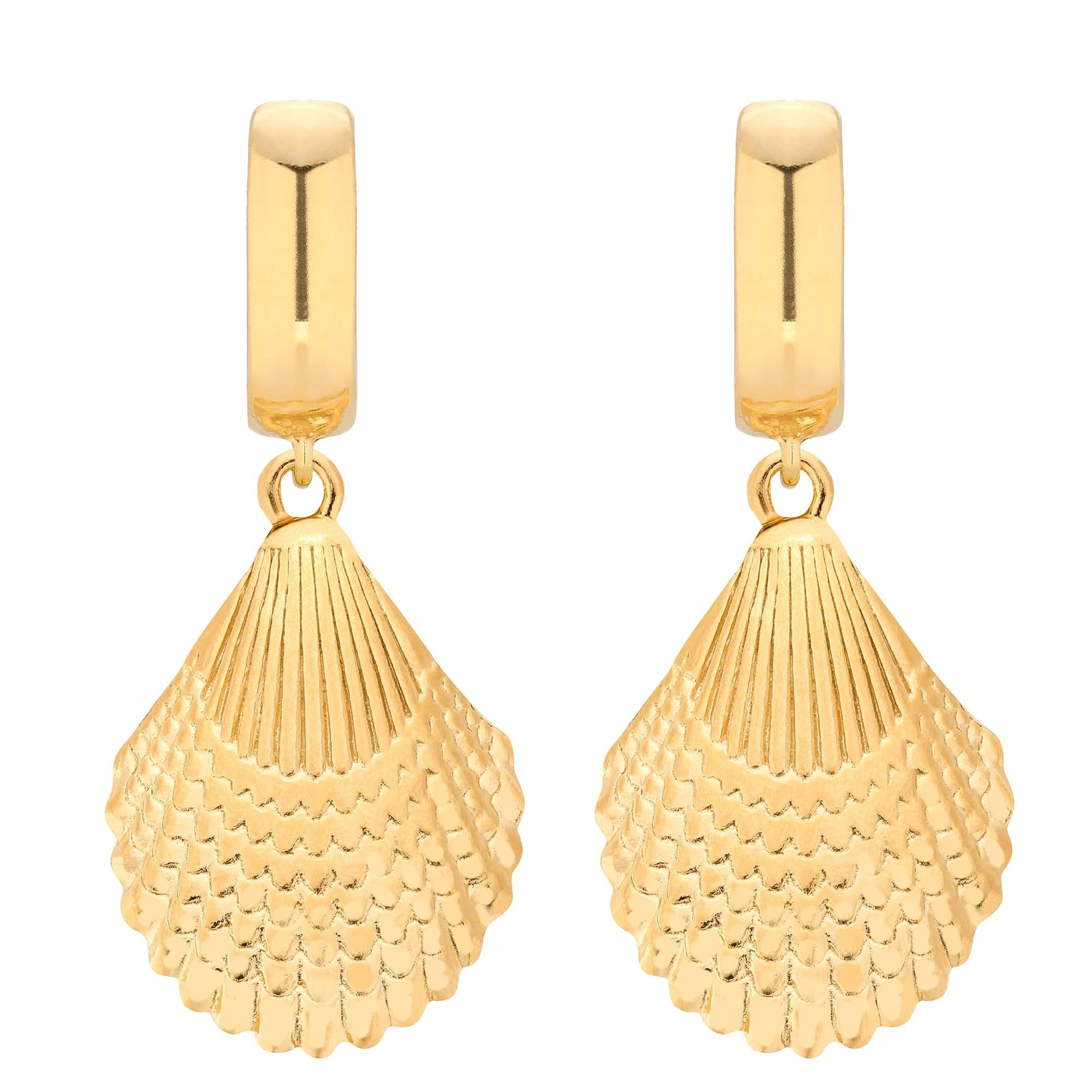 Złote duże kolczyki z muszlami. Zapinane na bigle. Całość wykonana ze srebra 925 powlekanego 24 karatowym żółtym złotem.