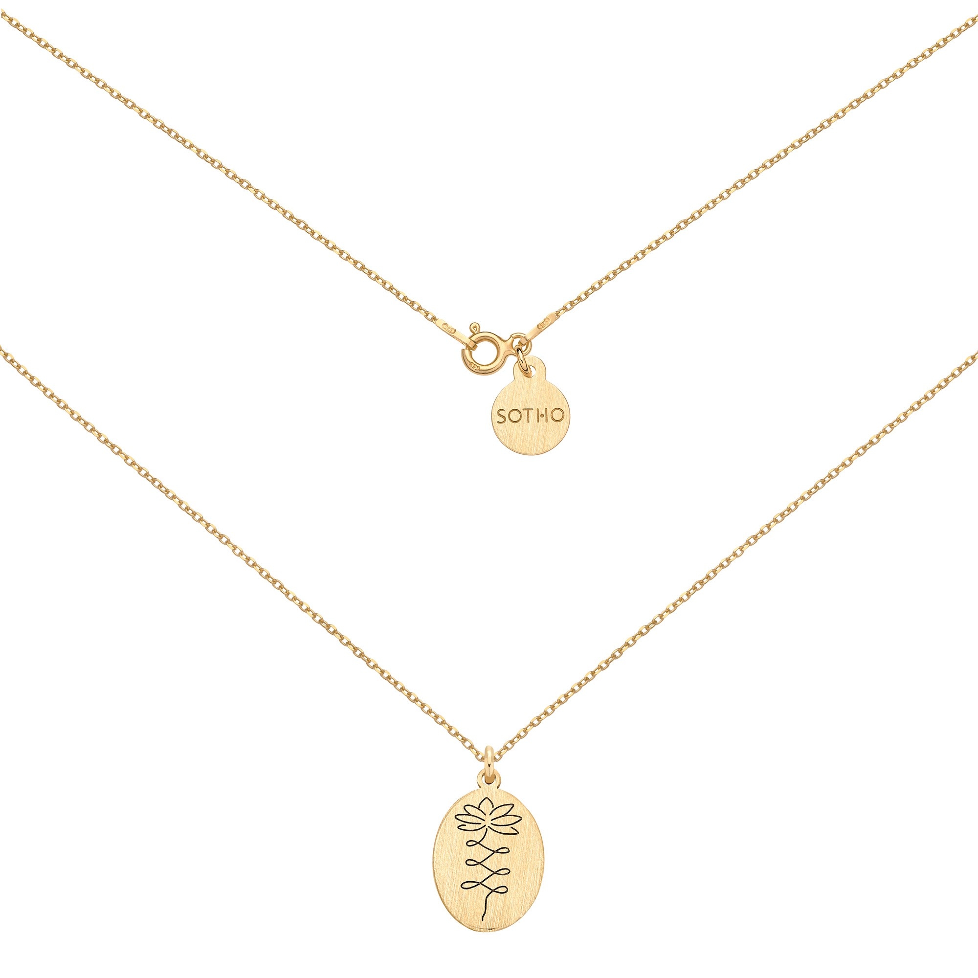 Złoty matowy medalion z lotosem i zawieszką z logo marki. Całość wykonana ze srebra 925 powlekanego 24 karatowym żółtym złotem.