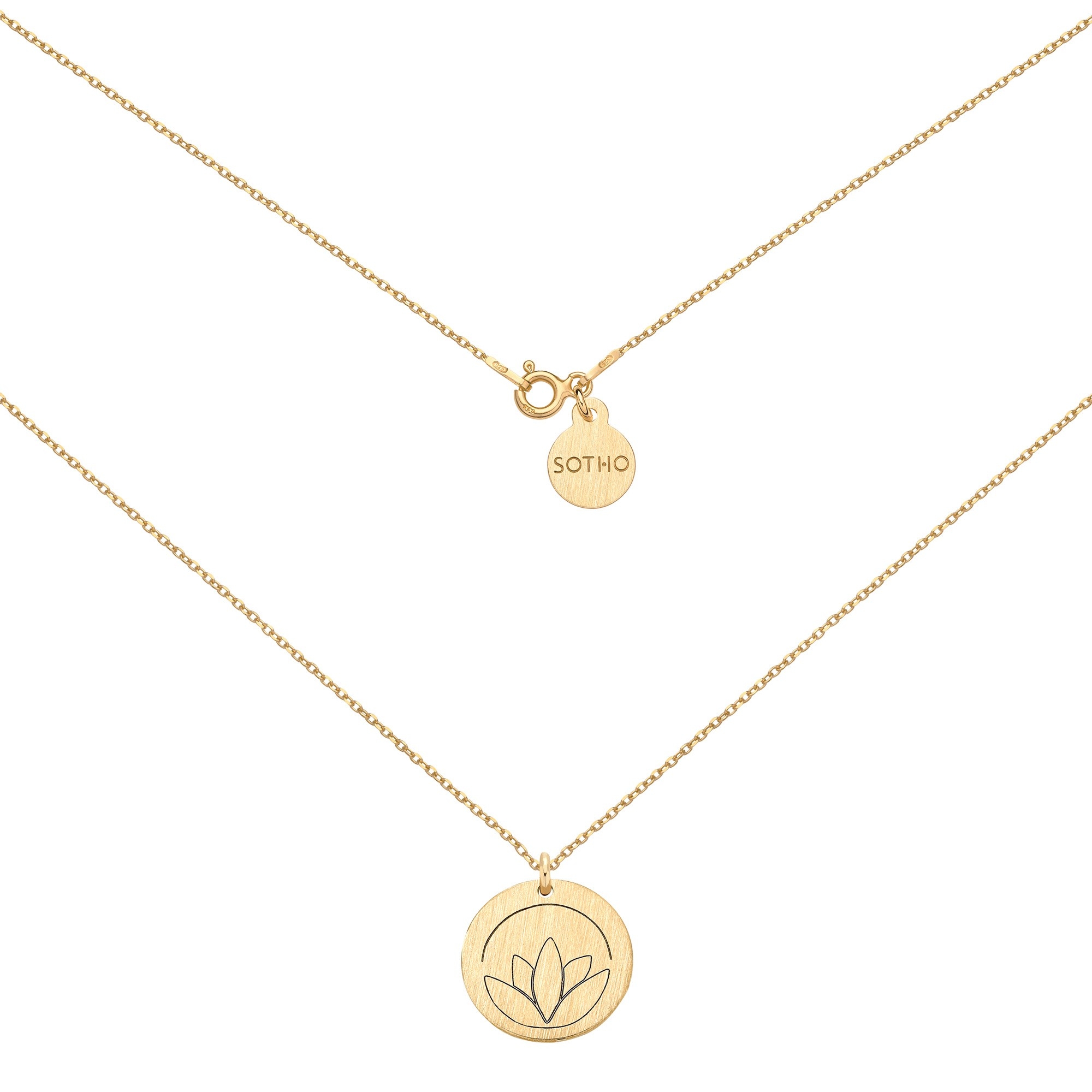 Złoty matowy medalion z lotosem i zawieszką z logo marki. Całość wykonana ze srebra 925 powlekanego 24 karatowym żółtym złotem.