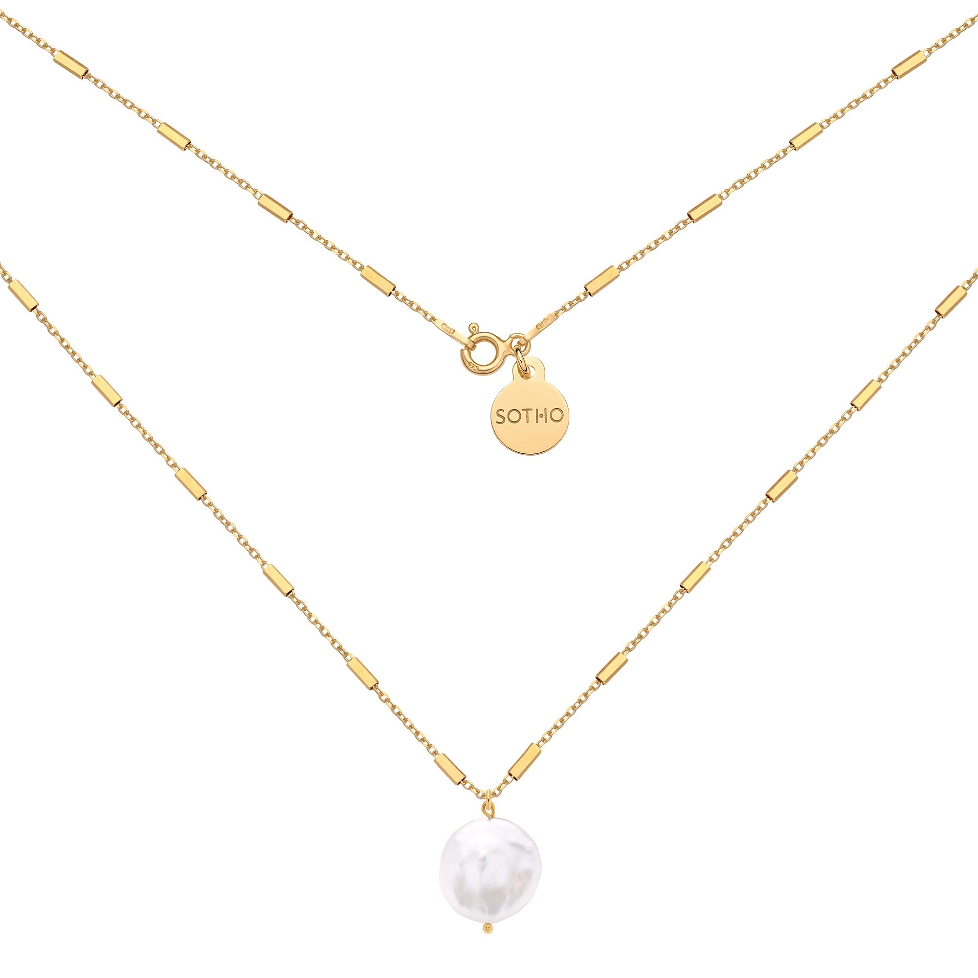 Złoty naszyjnik z naturalną nieregularną perłą. Całość wykonana ze srebra 925 powlekanego 24 karatowym żółtym złotem. Perła jest płaska, nieregularna, unikatowa i może różnić się od tej na zdjęciu.