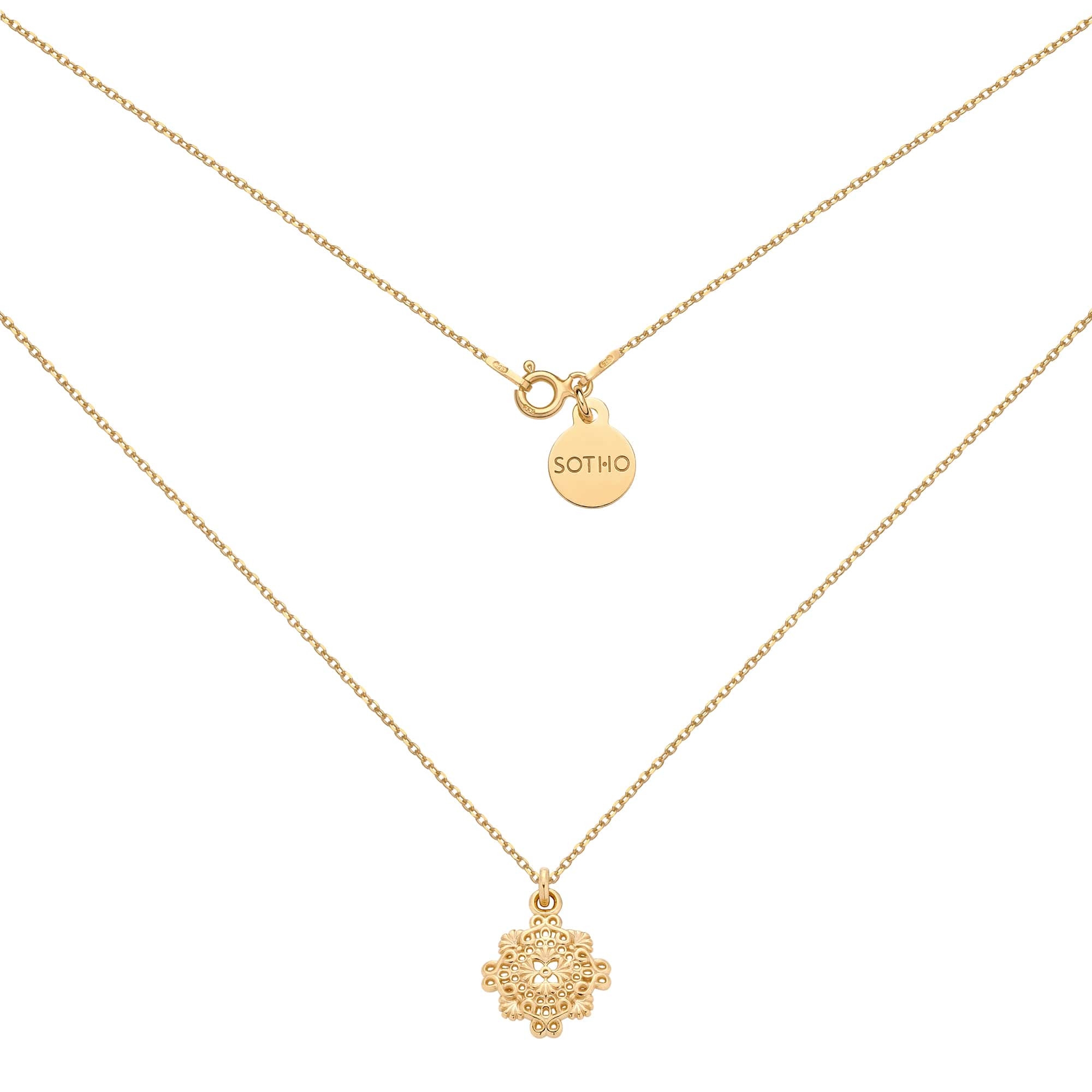 Złoty naszyjnik łańcuszkowy zdobiony rozetą i zawieszką z logo marki. Całość wykonana ze srebra 925 powlekanego 24 karatowym żółtym złotem.